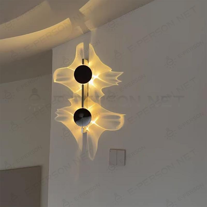 This artistic wall lamp features a unique double-disc design combined with soft ambient lighting effects, creating a visually striking atmosphere. The light diffuses around the structure, producing an elegant halo effect on the wall.