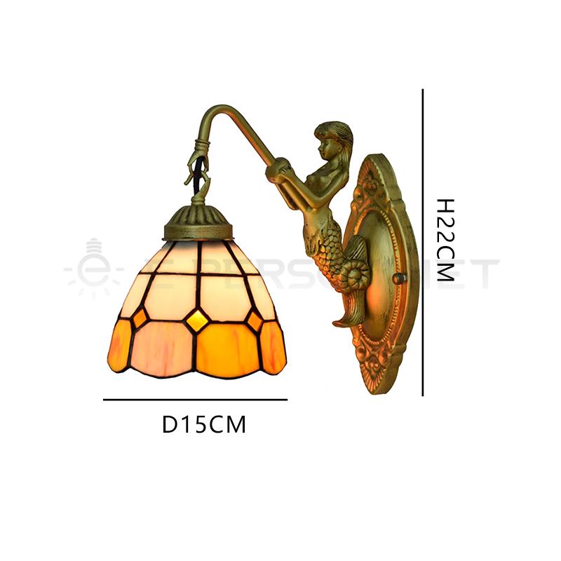 This exquisite wall lamp features a stained glass shade paired with a beautifully sculpted mermaid figure in antique bronze finish. The warm-toned art glass creates a soft, inviting glow, while the detailed mermaid design adds a touch of elegance and artistic flair. Perfect for bedrooms, hallways, living rooms, cafés, vintage-themed restaurants and boutique hotels, this wall sconce blends classic craftsmanship with decorative aesthetics. The durable metal structure ensures long-lasting use, and the unique art glass pattern makes each piece visually stunning. Compatible with E26/E27 bulbs and easy to install.