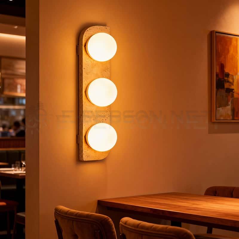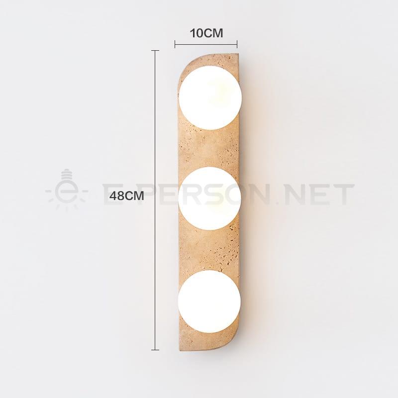 This Wabi-Sabi inspired vertical wall lamp features a stone-textured rectangular base with rounded corners and three evenly spaced frosted globe lights. Its symmetrical layout and natural finish bring elegance, warmth, and balance to any vertical lighting application — whether as a vanity light, display lamp, or modern hallway sconce.