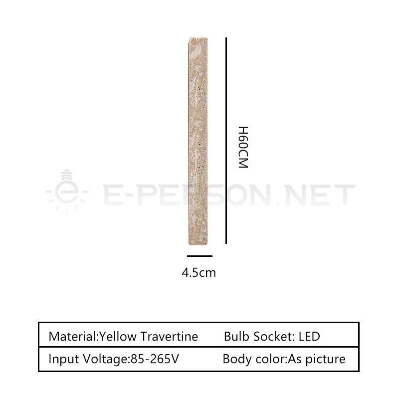 Bring architectural elegance to your space with this natural travertine wall lamp, available in three sizes: 60cm, 90cm, and 120cm. Designed with a clean vertical form and crafted from genuine yellow travertine, this lamp softly illuminates the wall with a warm up-and-down glow. The integrated G4 warm LED bulbs make it both energy-efficient and aesthetically pleasing. Whether you need a single accent light or want to create a stunning lighting sequence, this series fits seamlessly into modern interiors — perfect for hallways, staircases, bedrooms, and living spaces.
