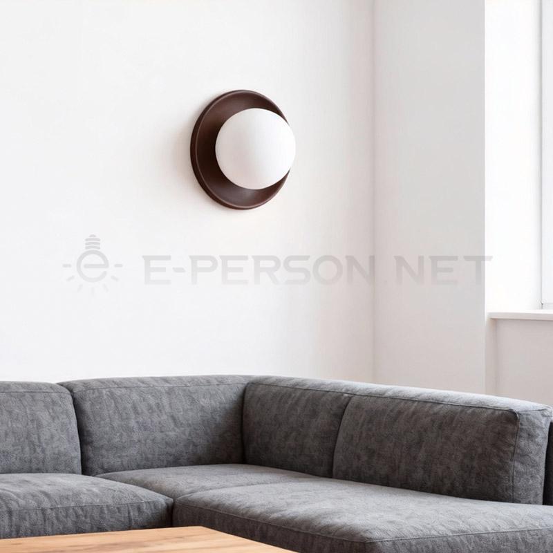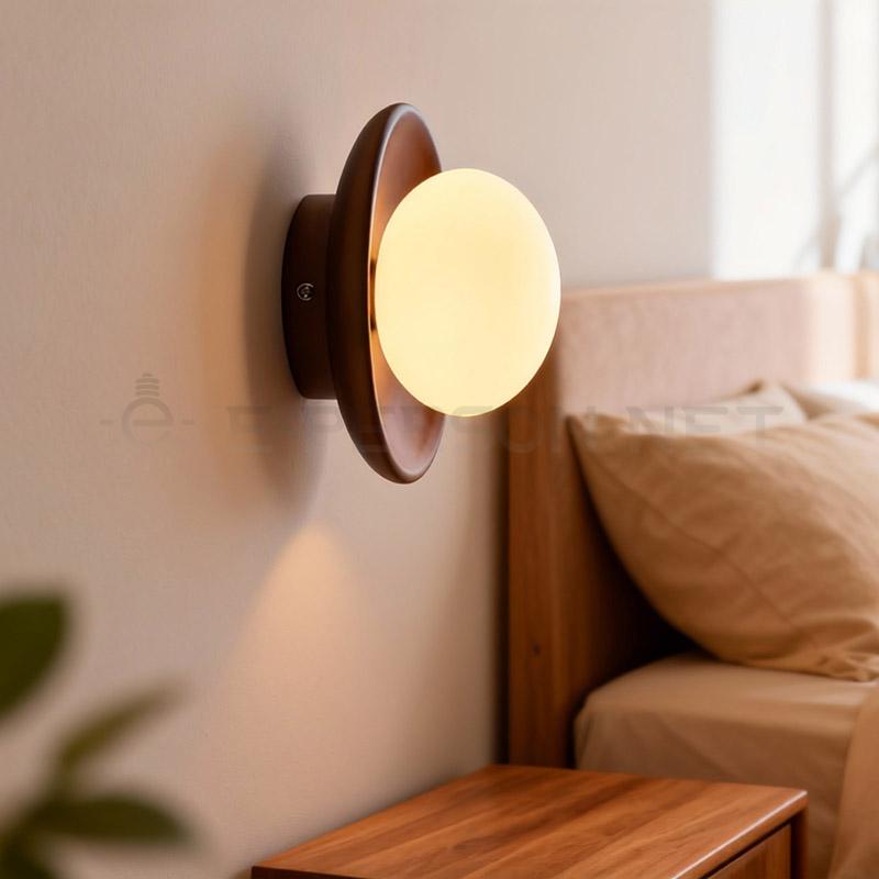 This Nordic wooden wall lamp features a refined dark solid wood backplate combined with an opal glass globe, delivering a warm yet understated minimalist aesthetic.