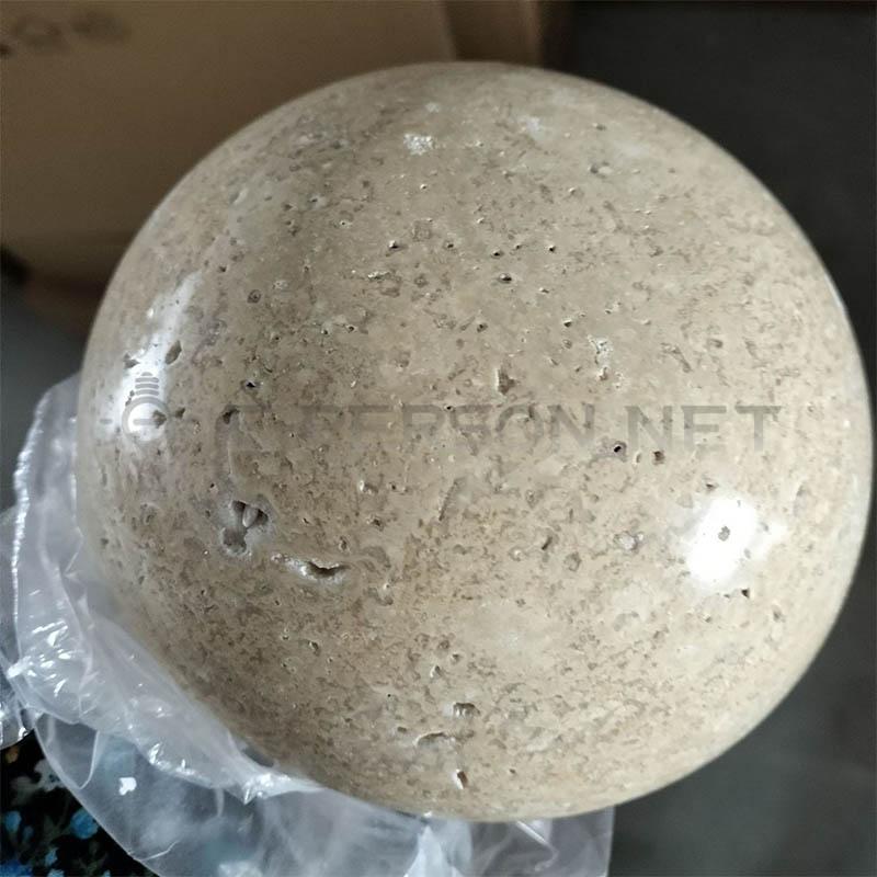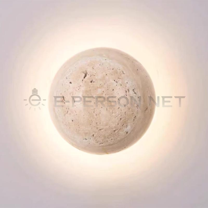 This indoor wall light features a round shape with natural travertine stone texture, designed to provide soft ambient back lighting.