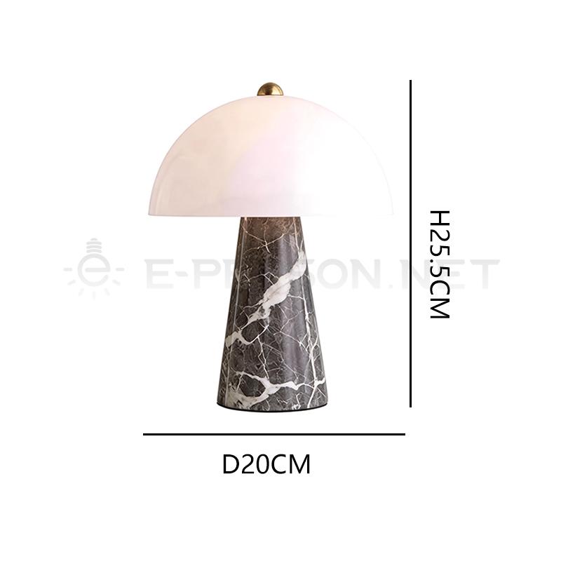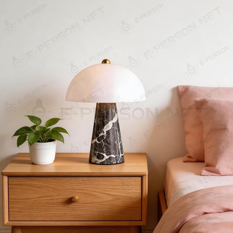 The marble base showcases unique natural veining patterns, making each lamp visually distinctive. The curved glass shade gently diffuses the light, producing a soft and comfortable illumination.
